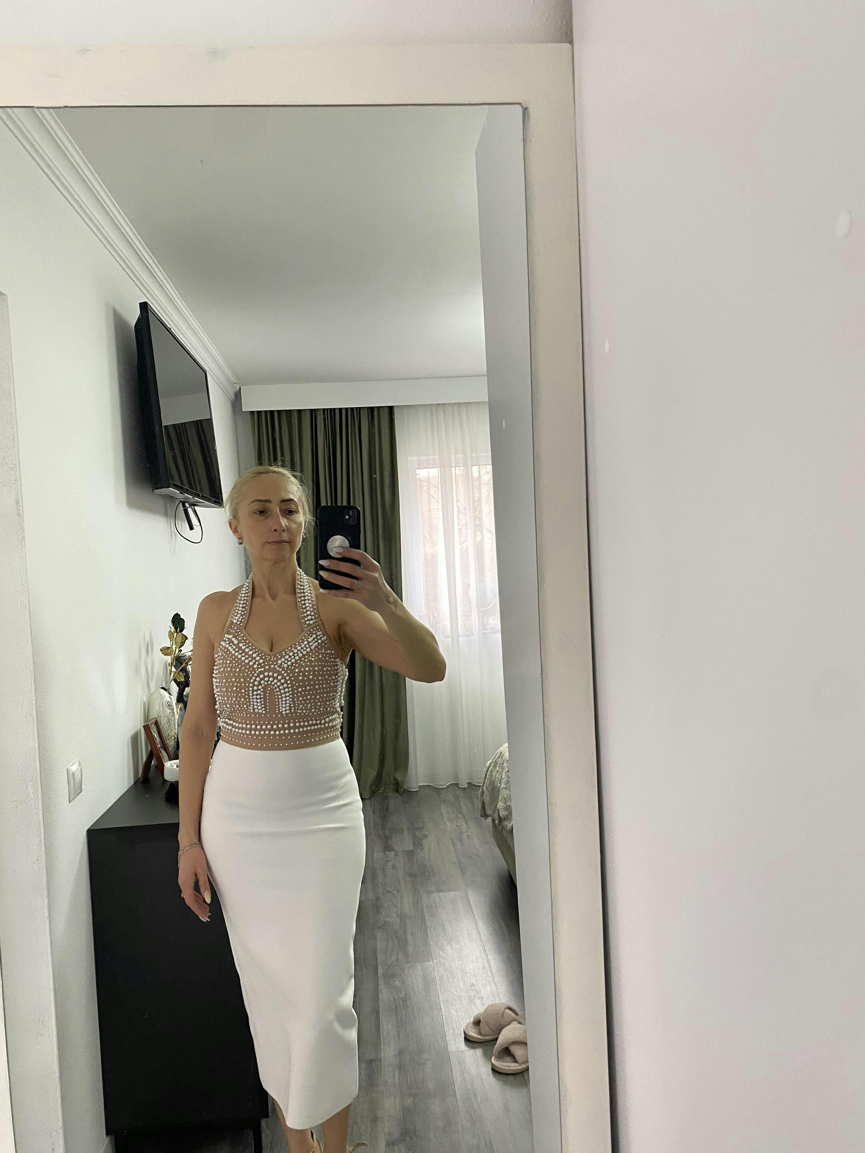 Rochia 'Cornelia Pearl' este o piesă ultra-sexy, cu o croială bodycon, completată cu un decolteu halter, bază din material bandaj, lungime midi și detalii uimitoare cu perle. Asortează-o cu tocurile și cerceii tăi preferați pentru a finaliza look-ul.
